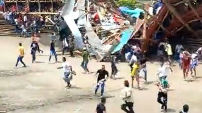 Imágenes divulgadas en redes sociales muestran el momento en que la gradería colmada de público se desploma durante una “corraleja”, una clase de fiesta popular en la que el público baja a la arena para enfrentarse a novillos o toros pequeños.