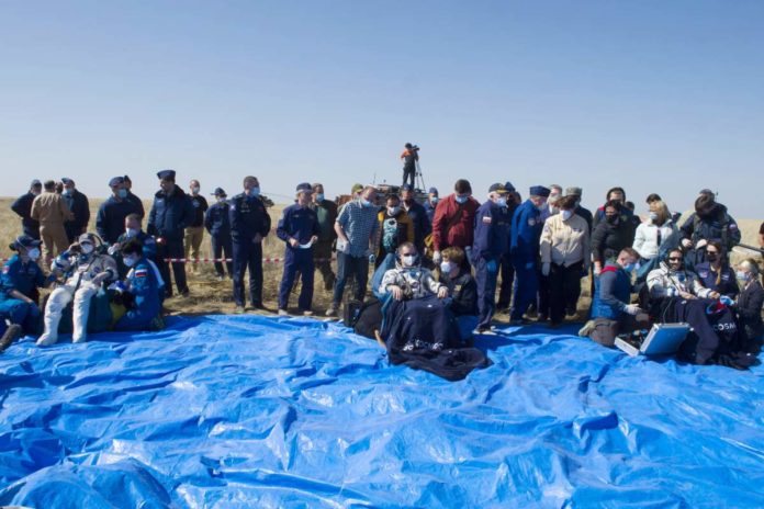 La cápsula Soyuz que transportaba a Kate Rubins, de la NASA, y a Sergei Ryzhikov y Sergei Kud-Sverchkov, de Roscosmos, aterrizó a las 12:55 horas en las estepas de Kazajistán.