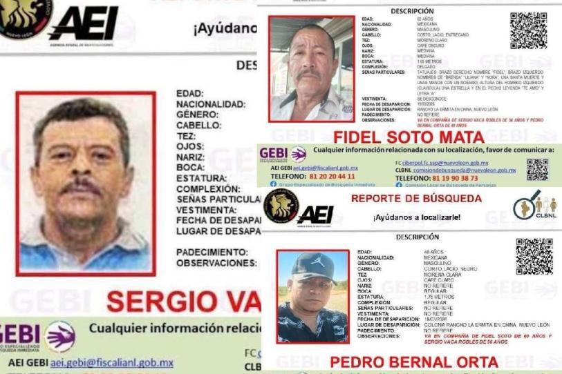 El Grupo Especializado de Búsqueda Inmediata (GEBI) emitió el Reporte de Búsqueda para dar con el paradero de Fidel Soto Mata, de 60 años; Pedro Bernal Orta, de 40 años y Sergio Vaca Robles, de 56 años.
