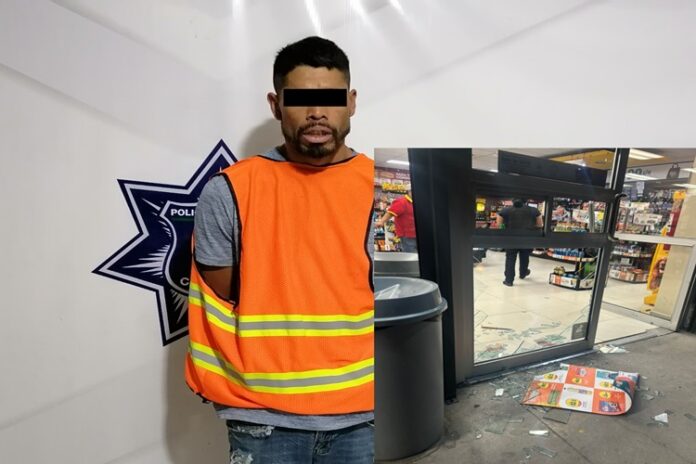 Con los datos aportados se implementó un operativo de búsqueda localizando metros más adelante a un sujeto que cumplía con la descripción, el cual fue plenamente identificado como la persona que minutos antes ocasionó daños en las puertas de la negociación, motivo por el cual realizaron el arresto de quien se identificó como Junior V. R. de 32 años.