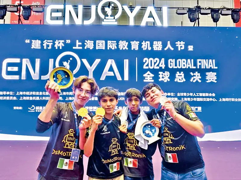 Estudiantes guanajuatenses de bachillerato hicieron el uno, dos en el Mundial de Robótica Educativa Enjoy de Inteligencia Artificial 2024, celebrado en Shanghái, China.