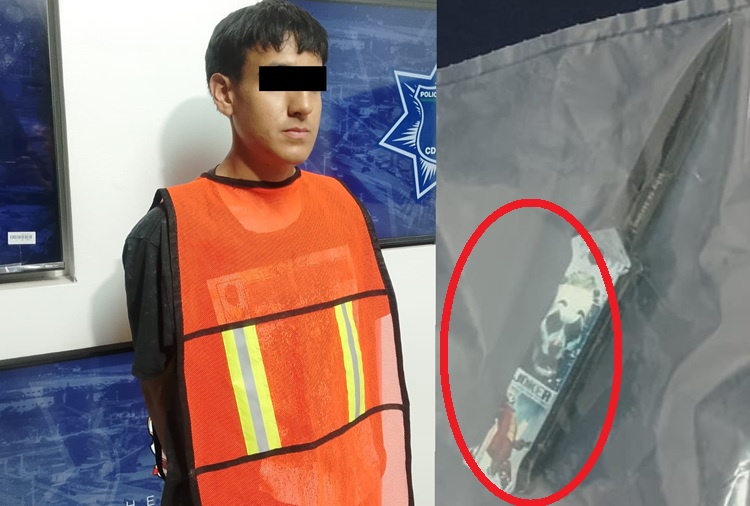 Con las características proporcionadas los oficiales ubicaron metros más adelante a un individuo que se retiraba del lugar a toda prisa, y tras ser reconocido plenamente por el afectado como el responsable del hecho, procedieron a asegurar a quien se identificó como Ángel Israel G. M. de 18 años, al cual se le localizó la navaja entre sus prendas de vestir, la cual tenía imagen de El Jocker.