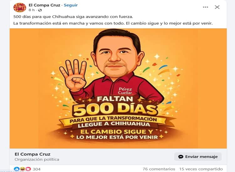 Por ejemplo hay una página que se llama El Compa Cruz, donde van subiendo fotografías caricaturizadas del edil juarense, donde trata de conectar con el público, sin pronunciarse abiertamente sobre sus intenciones de ser candidato a gobernador.