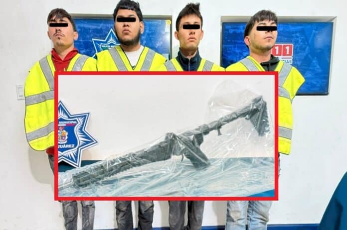 Ciudad Juárez, Chih.- Elementos de la Secretaría de Seguridad Pública Municipal, adscritos a la Estación de Policía del Distrito Sur, realizaron la detención de Jonathan R. S., Juan Andrés M. G., Cristian M. M. y Uriel Alejandro R. C., por su presunta responsabilidad en la comisión de delitos contra la ley federal de armas de fuego y explosivos, tras asegurarles un fusil de asalto y varios cartuchos útiles.