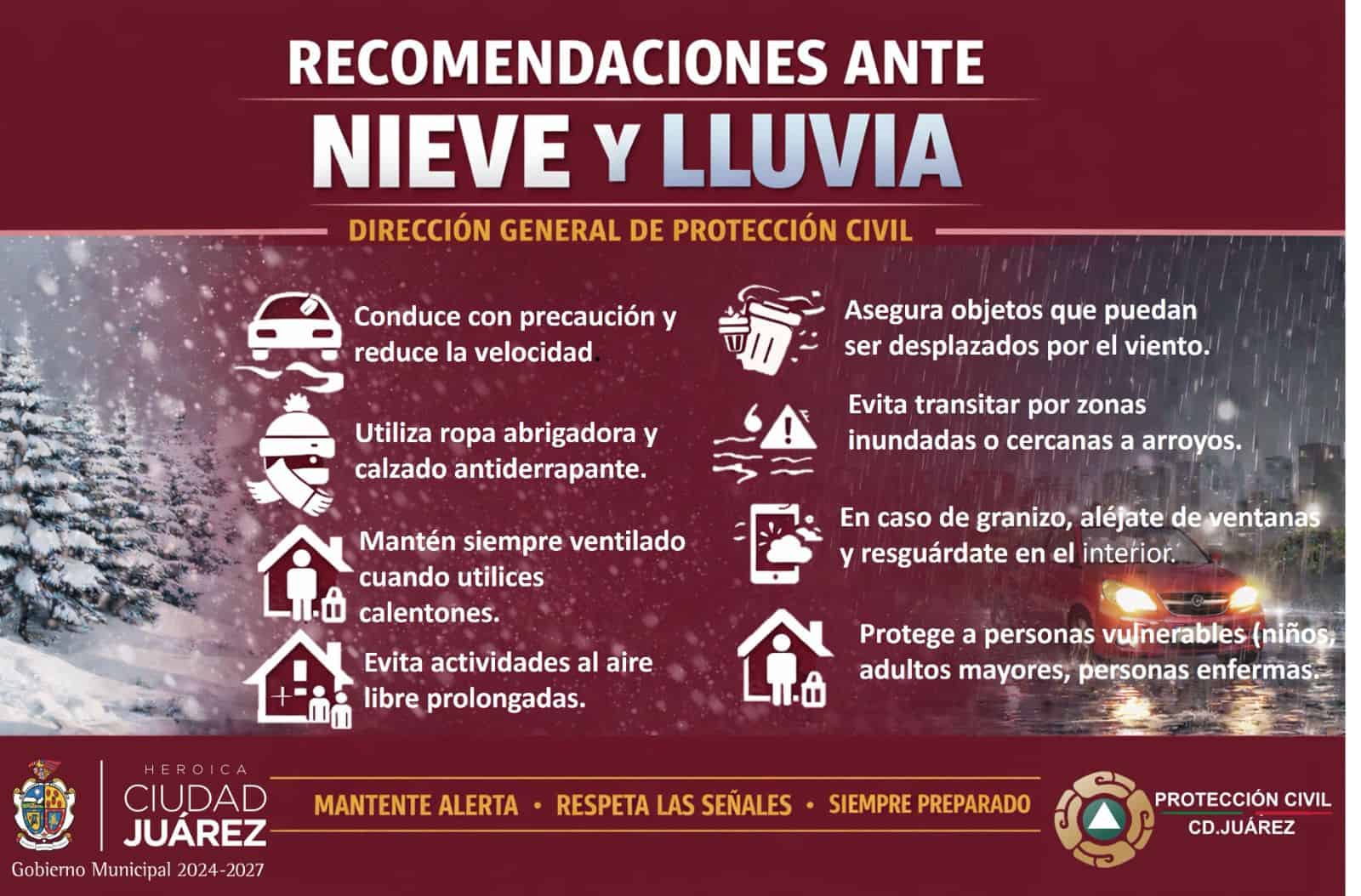 Ciudad Juarez Chih.- La Dirección General de Protección Civil emitió un aviso preventivo la mañana de este 25 de enero de 2026, ante la continuidad de precipitaciones en forma de lluvia, aguanieve y nieve en distintos sectores de la ciudad.