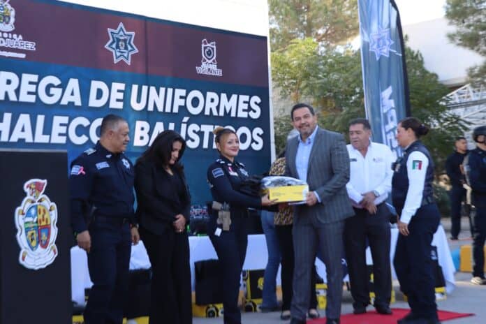 Ciudad Juárez, Chih.- Dentro de las acciones para reforzar la seguridad, uno de los ejes prioritarios de la actual administración, el Gobierno Municipal 2024-2027 realizó mediante un evento protocolario la entrega de equipo táctico a elementos de la Secretaría de Seguridad Pública Municipal y de Seguridad Vial.
