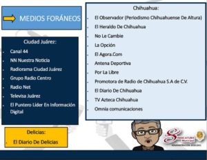 Entre los medios de Ciudad Juárez aparecen: Canal 44, Radiorama, RadioNet Televisa, El Puntero y Grupo Radiocentro.