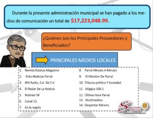 Parral, Chih.- El síndico del municipio de Parral, Idelfonso Caro Hernández, exhibió una lista de medios de comunicación del estado de Chihuahua, donde el presidente Alfredo Lozoya gasta más de 17 millones de pesos, un presupuesto que ha duplicado el recurso aprobado del año pasado.