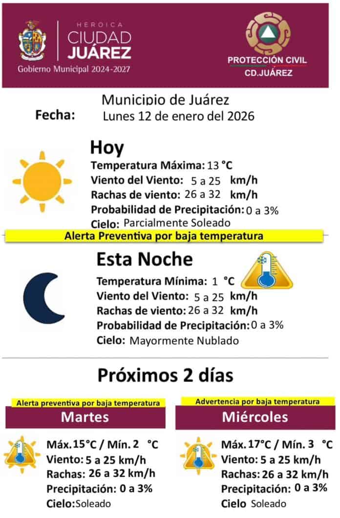 Ciudad Juarez Chih.- La Dirección General de Protección Civil del Municipio de Ciudad Juárez informó que este lunes 12 de enero de 2026 continúa vigente la alerta preventiva por baja temperatura, ante las condiciones climatológicas registradas y previstas para los próximos días.