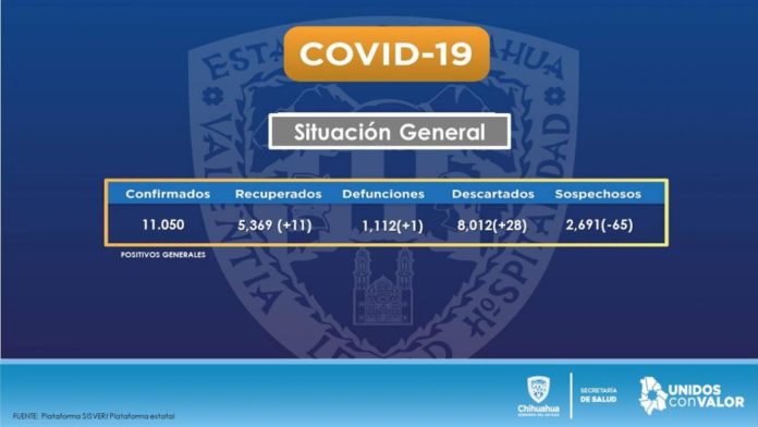 Chihuahua, Chih.- La Secretaría de Salud informó que según el corte de las 7:00 horas de este 25 de agosto, se tienen en el estado de Chihuahua un total general de 11,050 casos confirmados de COVID-19, así como 1,112 personas fallecidas.