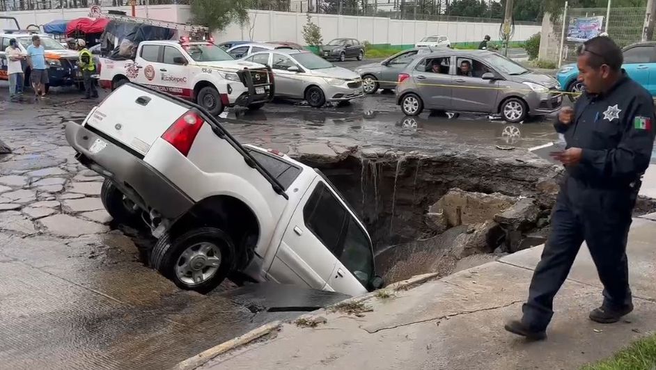 Según los primeros reportes, el conductor de una camioneta de carga circulaba en dirección a la colonia Valle de Aragón, en el municipio de Nezahualcóyotl, cuando el terreno comenzó a hundirse.
