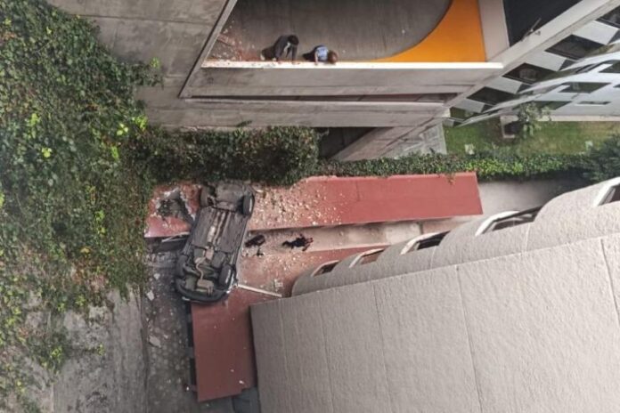 Auto con tres personas se desploma 10 metros en edificio de CDMX