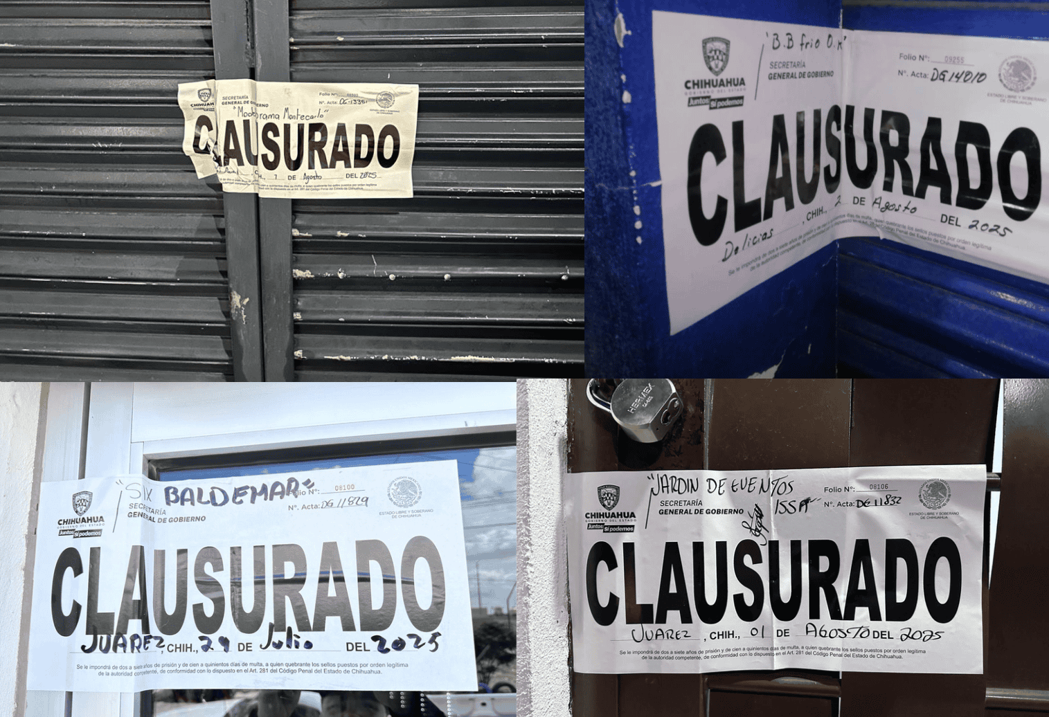 Dichas acciones derivaron en la clausura de 27 empresas del ramo: 5 en Chihuahua, 5 en Hidalgo del Parral, 4 en Delicias, 1 en Cuauhtémoc y 12 en Ciudad Juárez.