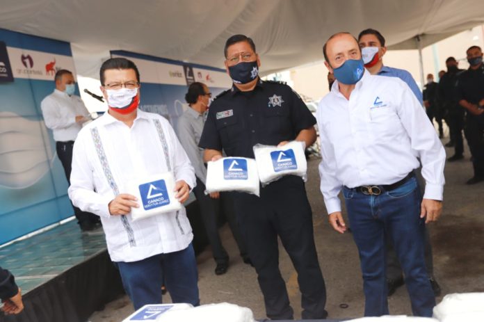 El donativo lo entregó el presidente de Canaco Ciudad Juárez, Rogelio González Alcocer, en la Estación de Policía del Distrito Sur, a fin de que estos insumos sean repartidos en la ciudad por parte de elementos de la Secretaría de Seguridad Pública Municipal (SSPM).