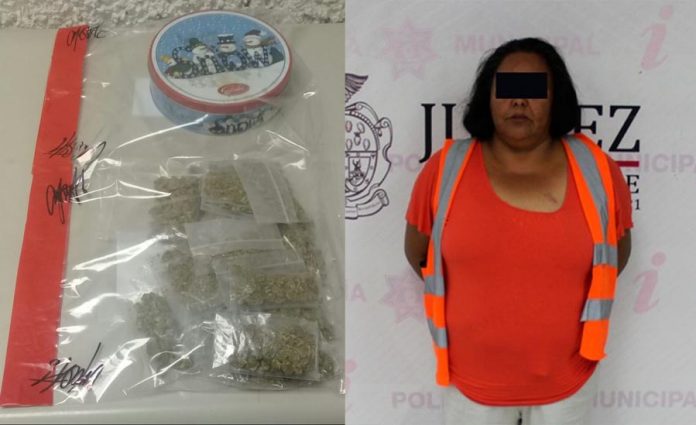 La detención se llevó a cabo luego de que policías municipales que recorrían la colonia kilómetro 29, fueron interceptados por un masculino, el cual denunció que una mujer se encontraba vendiendo droga en el cruce de las calles Alazán y Carretera a Casas Grandes.