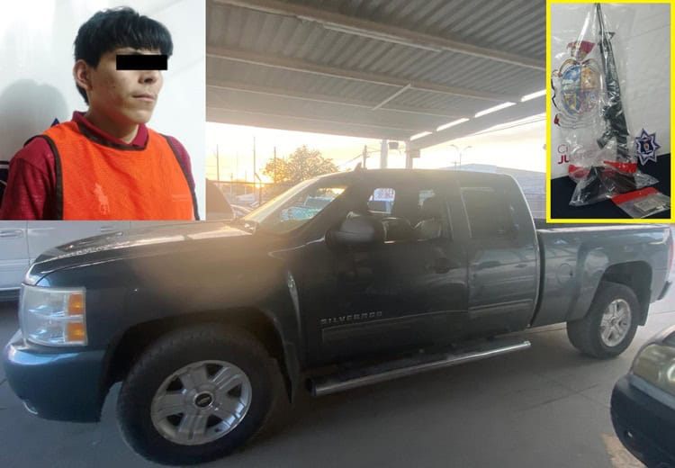 Ciudad Juárez, Chih.- Agentes de la Secretaría de Seguridad Pública Municipal detuvieron a Luis Mario M. B., por su presunta responsabilidad en la comisión de los delitos de posesión de vehículo con reporte de robo y violación a la ley federal de armas de fuego y explosivos.