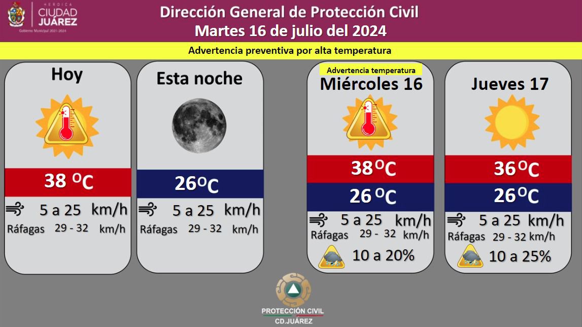 Ciudad Juárez, Chih.- La Dirección General de Protección Civil, con base en informes del Servicio Meteorológico Nacional, pronostica un martes soleado, con una temperatura máxima de 38 grados Celsius, mientras que la mínima será de 26 °C para esta noche.