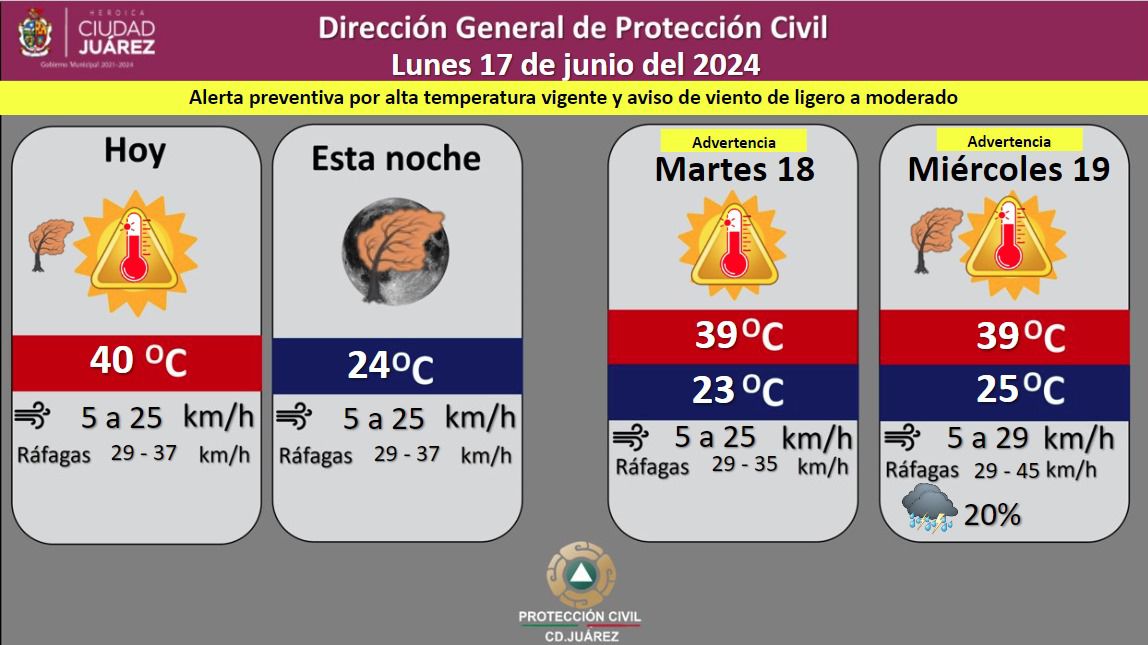Ciudad Juárez, Chih.- La Dirección General de Protección Civil, con base en informes del Servicio Meteorológico Nacional, pronostica un lunes mayormente soleado con una temperatura máxima de 40 grados Celsius, mientras que la mínima será de 24 °C para esta noche.