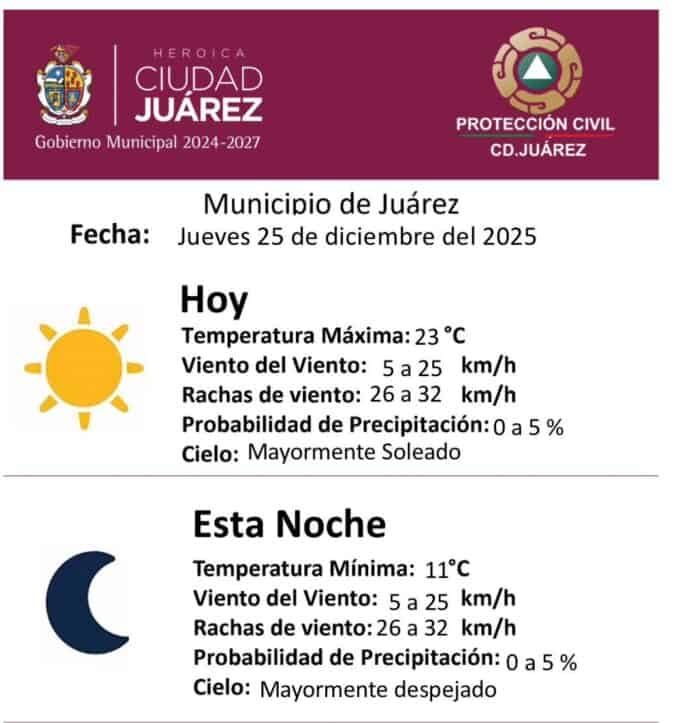 Ciudad Juarez Chih.- La Dirección General de Protección Civil informó que este jueves 25 de diciembre se espera un clima mayormente soleado en el municipio de Juárez, con una temperatura máxima de 23 grados centígrados. Durante el día, el viento se presentará con velocidades de entre 5 y 25 kilómetros por hora, con rachas que podrían alcanzar de 26 a 32 kilómetros por hora, mientras que la probabilidad de precipitación se mantiene baja, entre 0 y 5 por ciento.