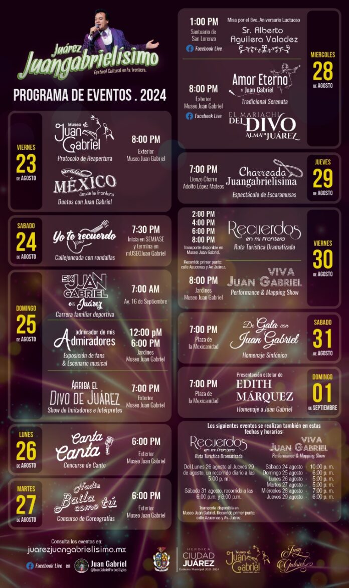 Explicó que el domingo 25 de agosto realizarán a las 7:00 de la mañana la carrera familiar deportiva de 5 kilómetros “Juan Gabriel es Juárez”, el arranque y meta serán en la avenida 16 de Septiembre y calle Perú; además se llevará a cabo “Admirador de mis admiradores”, exposición de fans y escenario musical a las 12:00 del mediodía en los jardines del museo del cantante; ese mismo día será el show de Imitadores del Divo de Juárez, en el mismo lugar.