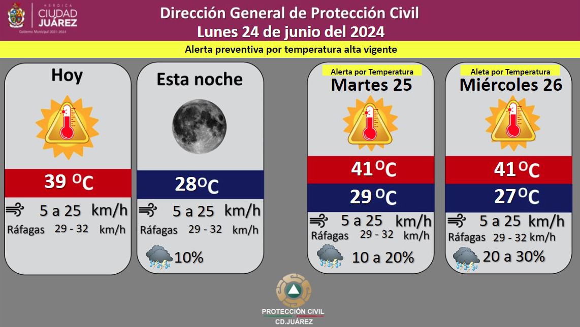 Ciudad Juárez, Chih.- La Dirección General de Protección Civil, con base en informes del Servicio Meteorológico Nacional, pronostica un 10 por ciento de probabilidad de lluvia para este lunes, con una temperatura máxima de 39 grados Celsius, mientras que la mínima será de 28 °C para esta noche.