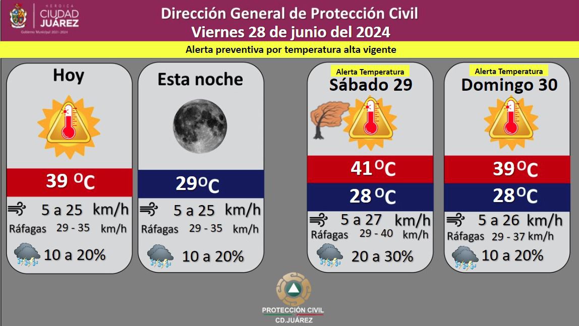 Ciudad Juárez, Chih.- La Dirección General de Protección Civil, con base en informes del Servicio Meteorológico Nacional, pronostica un 20 por ciento de probabilidad de lluvia para este viernes, con una temperatura máxima de 39 grados Celsius, mientras que la mínima será de 29 °C para esta noche.