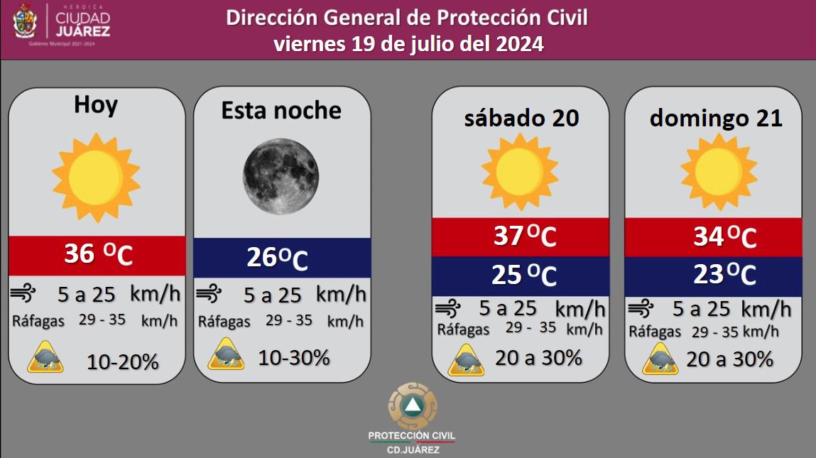 Ciudad Juárez, Chih.- La Dirección General de Protección Civil, con base en informes del Servicio Meteorológico Nacional, pronostica un 30 por ciento de probabilidad de lluvia para este viernes, con una temperatura máxima de 36 grados Celsius, mientras que la mínima será de 26 °C para esta noche.
