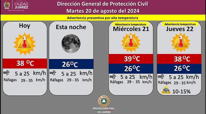 Ciudad Juárez, Chih.- La Dirección General de Protección Civil informa que para hoy martes, se espera un cielo despejado, con temperatura máxima de 38 grados Centígrados y mínima de 26 grados.