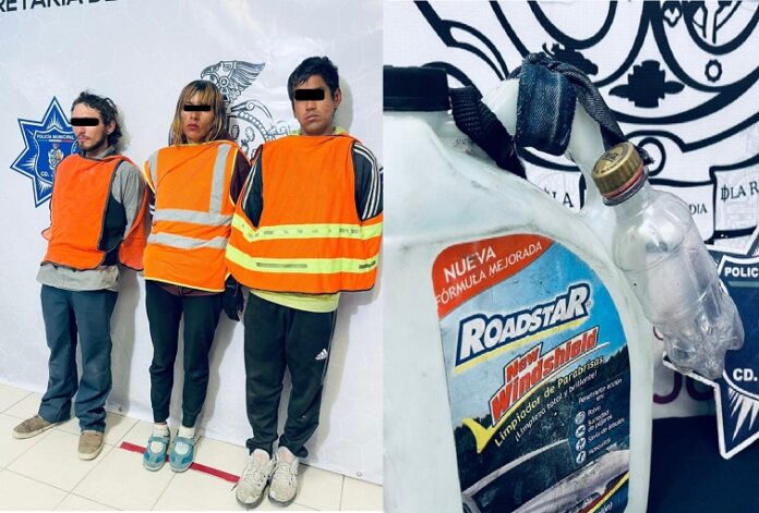 Con los datos obtenidos, los oficiales implementaron acciones de búsqueda localizando a tres personas que reunían las características proporcionadas, motivo por el cual las abordaron y al realizarles una inspección se les encontró un recipiente de plástico con combustible, procediendo a su arresto.
