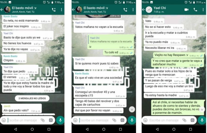 En las capturas de pantalla de WhatsApp se lee que el joven asegura en un grupo en el que están integrados estudiantes de esa Facultad, que tomó una escopeta de su tío, así como un arma corta, con las cuales haría junto con otras personas un tiroteo en la escuela este mismo lunes.