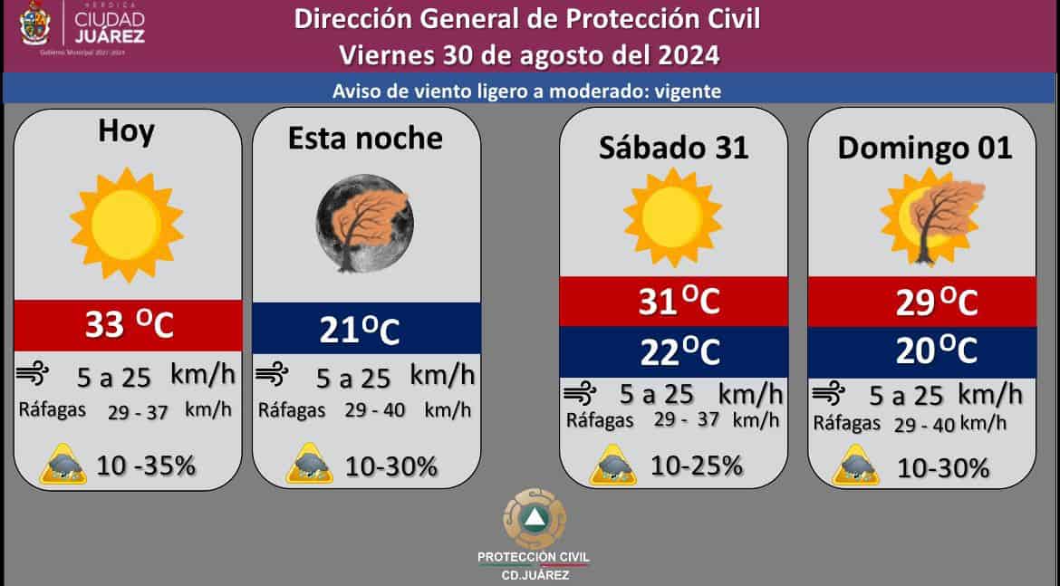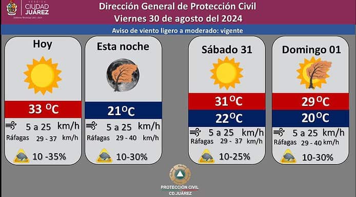 Ciudad Juárez, Chih.- La Dirección de Protección Civil informa que para hoy viernes se espera un cielo parcialmente nublado, con temperatura máxima de 33 grados Centígrados y mínima de 21 grados.