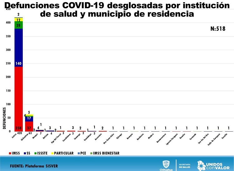 Defunciones por municipio e institución médica: Juárez 238 IMSS, 140 Sector Salud, 28 Issste, 12 particular, 2 PCE; Chihuahua 37 IMSS, 17 Sector Salud, 4 Issste, 5 particular; Cuauhtémoc 3 IMSS; Guadalupe 1 IMSS, 1 Sector Salud; Ascensión 2 IMSS; Camargo 2 IMSS; Rosales 1 IMSS; Bachíniva: 1 Sector Salud; Meoqui 1 IMSS, 4 Sector Salud, 2 particular; Buenaventura 1 Sector Salud; Delicias 1 IMSS, 3 Sector Salud; Ignacio Zaragoza 1 IMSS; San Francisco del Oro 1 Sector Salud; Parral 2 IMSS, 1 IMSS Bienestar; Madera 1 Sector Salud; Coronado 1 IMSS Bienestar; Nuevo Casas Grandes 1 Sector Salud; Ojinaga 1 Sector Salud; Valle De Zaragoza 1 Sector Salud; Bocoyna 1 IMSS Bienestar y Saucillo 1 Sector Salud.