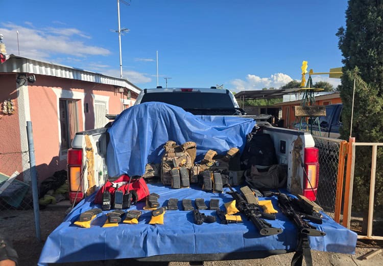 Sin embargo, al realizar una minuciosa revisión, se localizaron, dentro de una camioneta Ford Super Duty F-350, de color blanca, dos armas blancas, tres armas cortas, cargadores y dos chalecos tácticos.