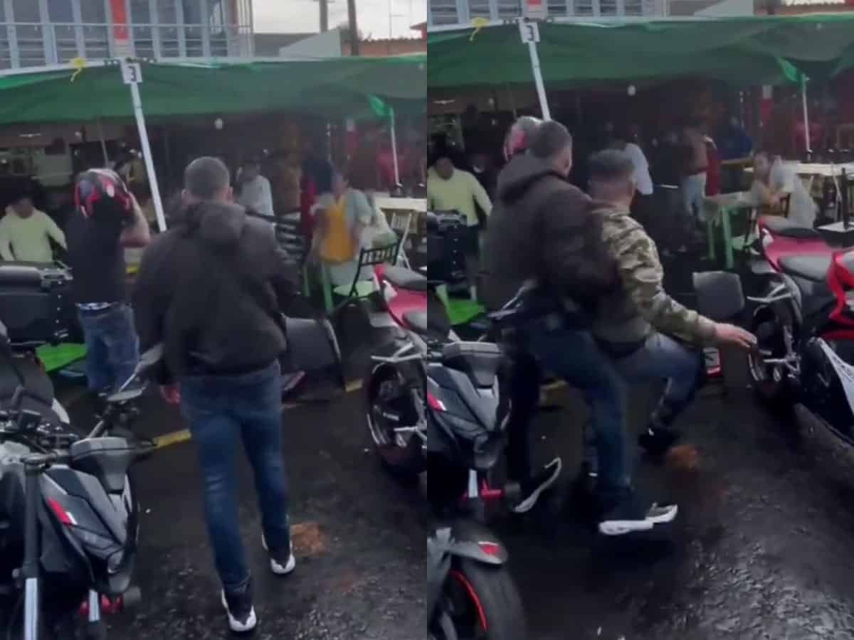 Segundos antes, empezaron a volar sillas y mesas en el interior de un local de comida. “¡Hasta una señora con su delantal estuvo involucrada en la trifulca!”. Se puede apreciar en uno de los múltiples videos que fueron filtrados a redes sociales, que “la doñita” toma una silla y la avienta contra tres bikers.
