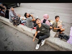 Imagen de Murat Sengül en la que gente observa ataque de drones israelíes.
