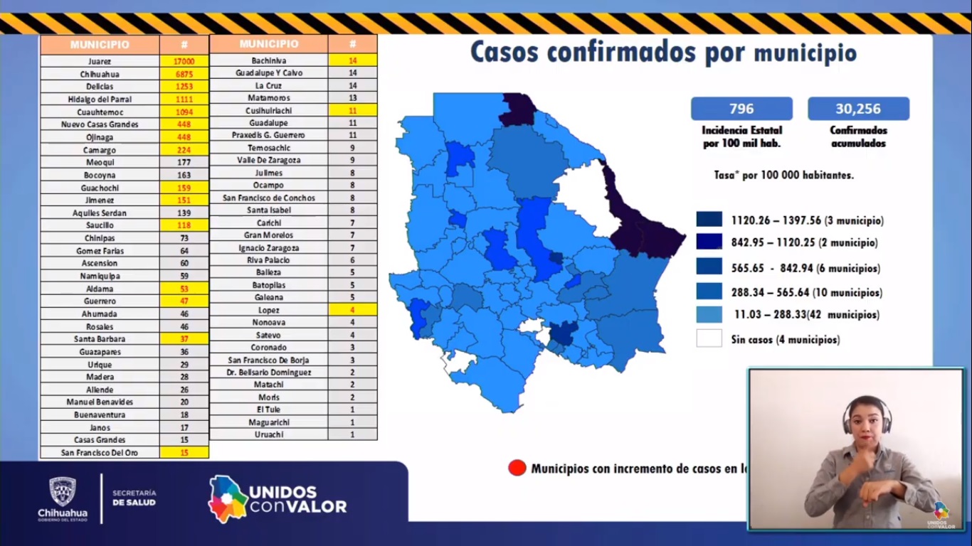 Ciudad Juárez, Chih. – La Doctora Leticia Ruiz informó que actualmente en todo el Estado de Chihuahua hay 30 mil 256 casos de covi-19 y 2 mil 421 muertes a causa del mismo.