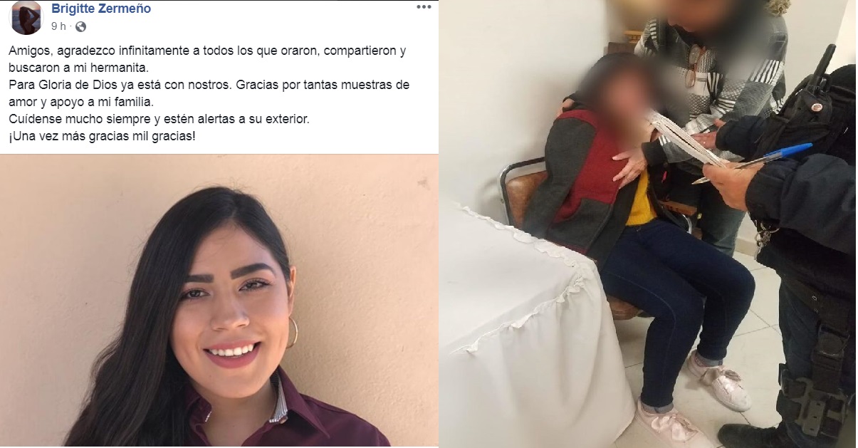 “Amigos, agradezco infinitamente a todos los que oraron, compartieron y buscaron a mi hermanita. Para Gloria de Dios ya está con nosotros. Gracias por tantas muestras de amor y apoyo a mi familia. Cuídense mucho siempre y estén alertas a su exterior. ¡Una vez más gracias mil gracias!”, publicó su hermana Brigitte Zermeño.