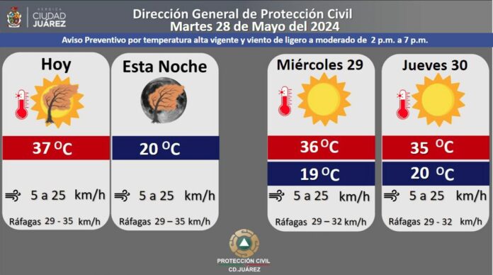 Ciudad Juárez, Chih.- La Dirección General de Protección Civil informa que el calor podría alcanzar hoy los 37 grados Centígrados, mientras que la mínima está pronosticada en 20 °C.