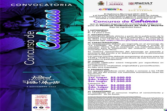 Ciudad Juárez, Chih.- Gobierno Municipal de Juárez 2021-2024, a través del Instituto para la Cultura del Municipio de Juárez (IPACULT), convoca a la comunidad, asociaciones civiles, escuelas y colectivos artísticos a formar parte del concurso de catrinas, evento que se llevará a cabo el día 02 de noviembre, dentro del “Festival Tradiciones Vida y Muerte”.