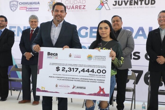 Ciudad Juárez, Chih.- Como parte de la estrategia para apoyar a los jóvenes que ingresan a la educación superior, el Presidente Municipal, Cruz Pérez Cuéllar, entregó hoy 977 becas de acceso a la universidad a estudiantes de la Universidad Tecnológica de Ciudad Juárez (UTCJ).