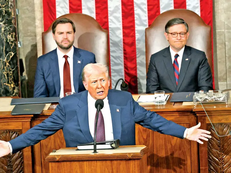 Con el vicepresidente JD Vance y el presidente de la Cámara de Representantes, Mike Johnson, detrás suyo, el republicano elogió los logros de sus primeras semanas de gobierno.