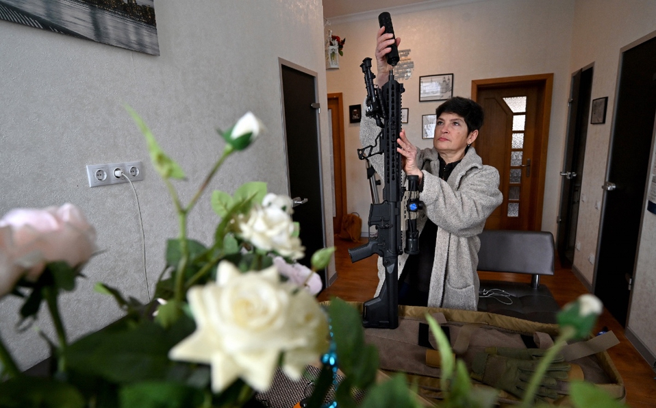 Mariana Jaglo, una reservista del Ejército de Ucrania, saca su fusil de un estuche kaki en el comedor de su casa en Kiev y asegura que no vacilará en defender a su país en caso de invasión rusa.