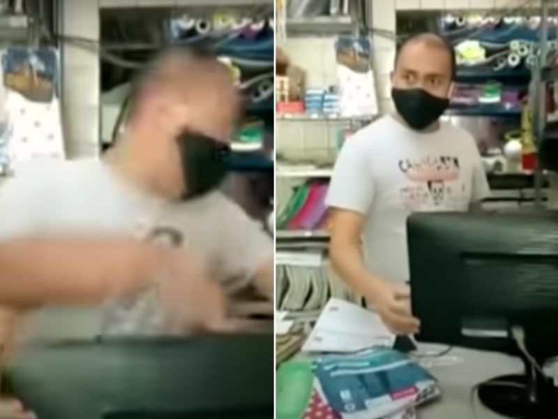 La víctima tomó un video en el que se observa que su padre le reclama al presunto acosador, quien se refugia en la parte posterior del negocio con su celular en mano.