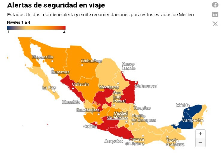 • Nivel 3 (Reconsidere viajar): Baja California, Chiapas, Chihuahua, Guanajuato, Jalisco, Morelos y Sonora.