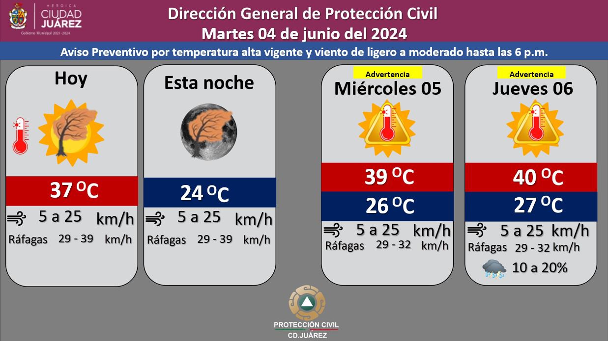 Ciudad Juárez, Chih.- La Dirección General de Protección Civil, con base en informes del Servicio Meteorológico Nacional, pronostica un martes parcialmente nublado con una temperatura máxima de 37 grados Celsius, mientras que la mínima será de 24 °C para esta noche.