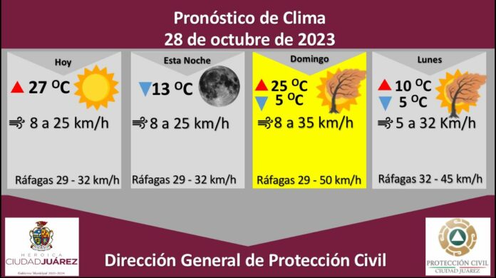 Ciudad Juàrez, Chih.- La Dirección General de Protección Civil, con base en informes del Servicio Meteorológico Nacional, pronostica un sábado soleado con una temperatura máxima de 27 grados Celsius, mientras que la mínima será de 13 °C para esta noche.