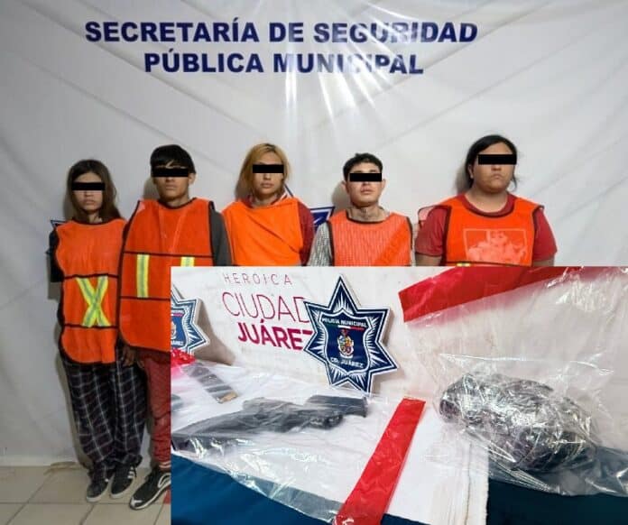 Ciudad Juárez, Chih.- Agentes de la Secretaría de Seguridad Pública Municipal adscritos en la Estación de Policía del Distrito Poniente capturaron a Edwin Jared L. C., Jaime Jovanny R. M., Vianney Michelle G. A., Ashley Nohemí S. M., Jennifer R. G y dos adolescentes, por su presunta responsabilidad en la comisión de delitos contra la ley federal de armas de fuego y explosivos, privación de la libertad, posesión de vehículos con reporte de robo y delitos contra la salud.