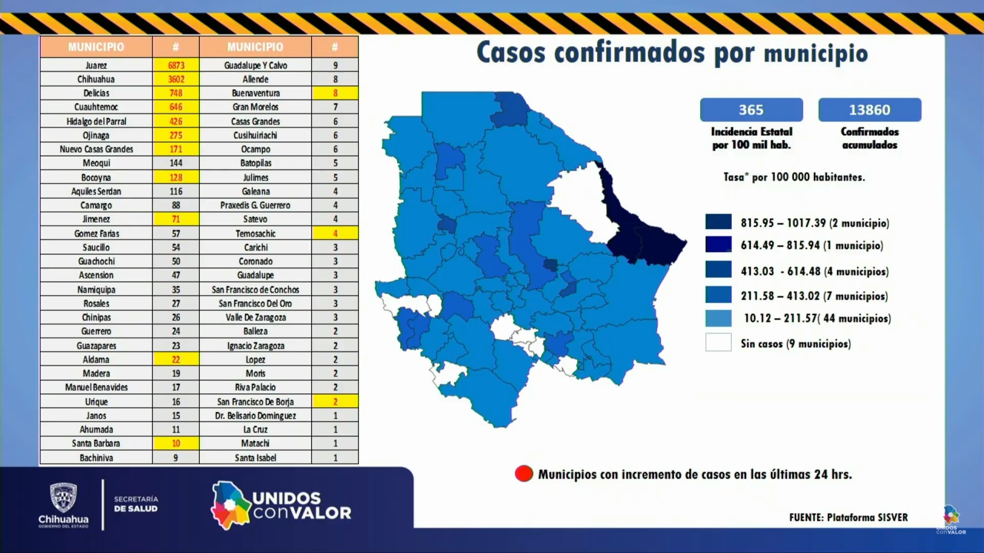 Ciudad Juárez, Chih.- En conferencia de prensa el Doctor Arturo Valenzuela, informó que actualmente en el Estado de Chihuahua, hay 13 mil 860 casos de covid y mil 302 muertes acumuladas.