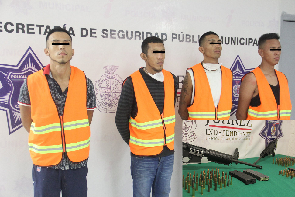 Ciudad Juárez, Chih.- Agentes de la Secretaría de Seguridad Pública Municipal realizaron el arresto de cuatro integrantes de la pandilla delictiva “Mexicles” identificados como Christian G. M., Gerardo Román T. Z., Luis Adrián M. y Luis Enrique D. V., por su presunta responsabilidad en la comisión de delitos contra la ley federal de armas de fuego y explosivos.
