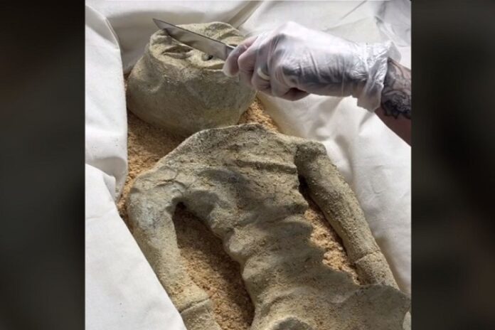 Tal como se observa en el video compartido por el creador de contenido de repostería, Ben Cullen, , el pastel de los seres no humanos se encuentra dentro de algo parecido a un sarcófago, sobre una manta blanca, justo como lo mostró el periodista mexicano hace unos días.